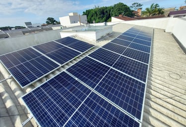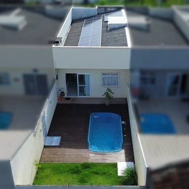 A casa tem 15 placas solares instaladas no telhado. Essas placas solares são capazes de gerar energia elétrica para duas casas (uma em Guaratuba e outra em Curitiba). Hoje o valor que pagamos em energia solar é de aproximadamente R$ 80,00 em cada residência.