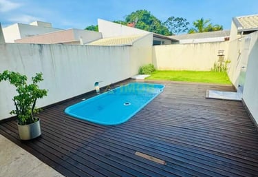 Um quintalzinho com grama, piscina e deck em madeira pronto para você deixar com a sua cara e curtir com a família e amigos. Esse quintal, além de ser muito gostoso é fundamental para a permeabilidade do terreno, ajudando o escoamento da água de chuvas e auxiliando na prevenção a alagamentos.